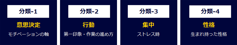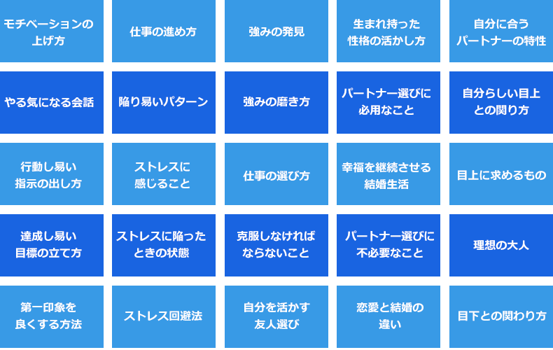 「意思決定」「行動」「ストレスに陥っている状態と回避法」「性格」「パートナーシップ」